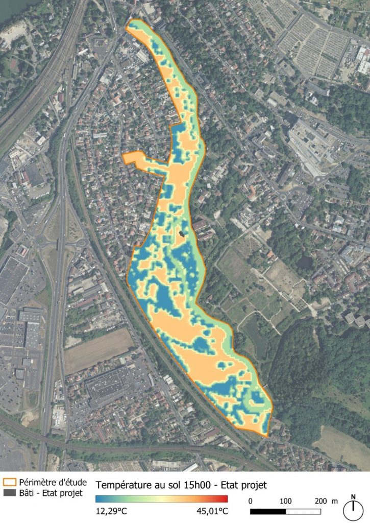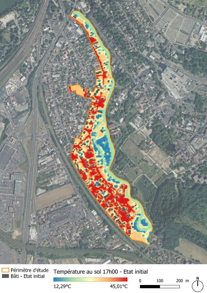 L’étude d’îlot de chaleur urbain a permis de modéliser l’évolution du comportement thermique du secteur entre son état actuel et futur.